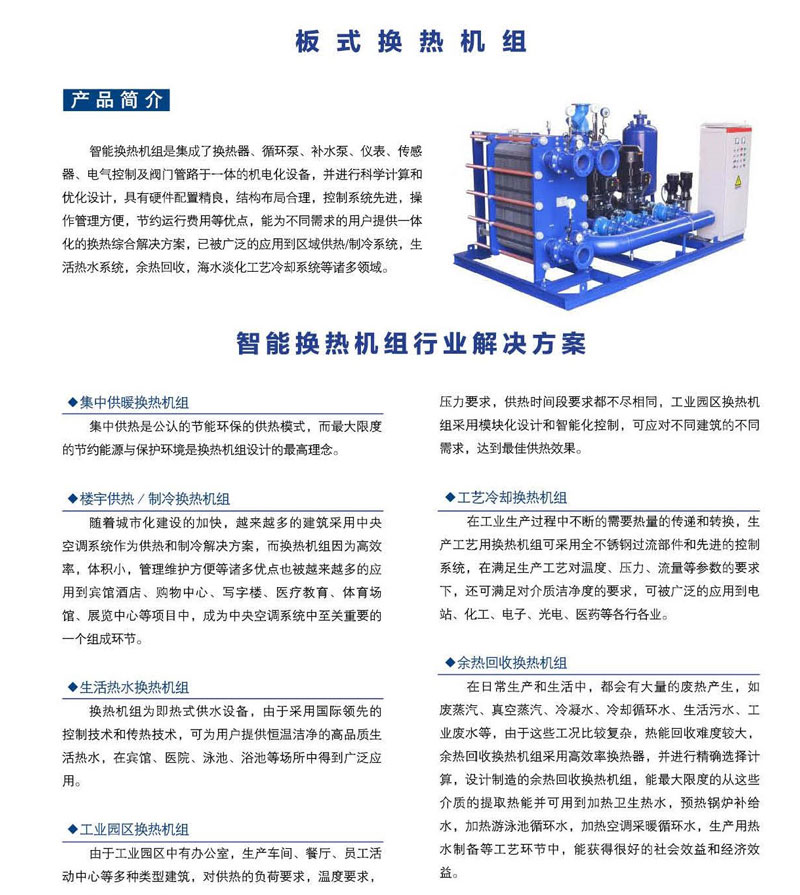 智能換熱機(jī)組是集成了換熱器、循環(huán)泵、補(bǔ)水泵、儀表、傳感器、電氣控制及閥門(mén)管路于一體的機(jī)電化設(shè)備,并進(jìn)行科學(xué)計(jì)算和優(yōu)化設(shè)計(jì),具有硬件配置精良、結(jié)構(gòu)布局合理、控制系統(tǒng)先進(jìn)、操作管理方便、節(jié)約運(yùn)行費(fèi)用等優(yōu)點(diǎn),能為不同需求的用戶提供一體化的換熱綜合解決方案,已被廣泛的應(yīng)用到區(qū)域供熱制冷系統(tǒng)、生活熱水系統(tǒng)、余熱回收海水淡化工藝?yán)鋮s系統(tǒng)等諸多領(lǐng)域。
