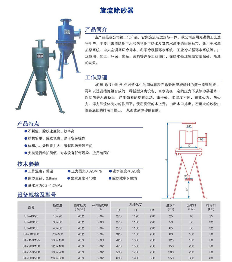 旋流除砂器集旋流與過濾與一體,主要用來清除地下水和包括地下熱水及其它水源中的固體顆粒,適用于水源熱泵系統(tǒng)、中央空調(diào)循環(huán)冷卻水、冬季冷暖循環(huán)水系統(tǒng)、工業(yè)冷卻循環(huán)水系統(tǒng)等,廣泛應(yīng)用于化工、環(huán)保、食品、醫(yī)藥等許多工業(yè)部門在給水處理領(lǐng)域?qū)崿F(xiàn)除砂、降濁的功效。