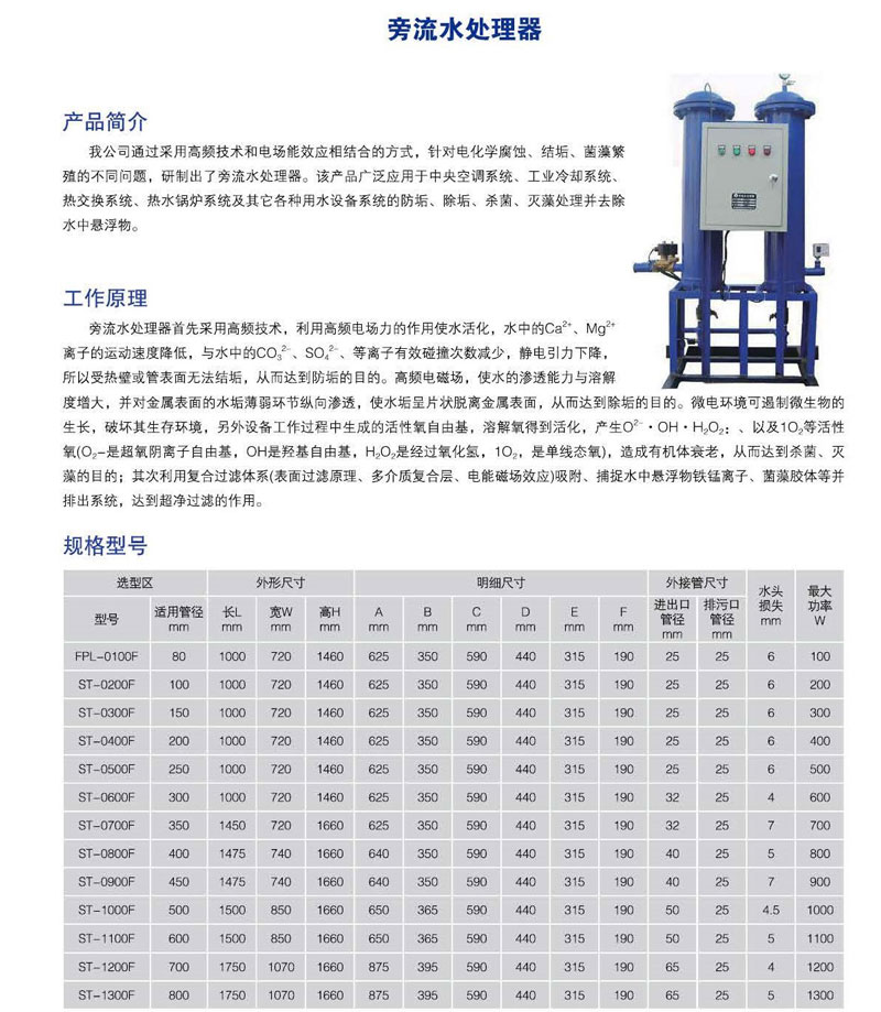 旁流水處理器是用高頻技術(shù)和電場(chǎng)能效應(yīng)相結(jié)合的方式,主要針對(duì)電化學(xué)腐蝕、結(jié)垢、菌藻繁殖的不同問題。該產(chǎn)品廣泛應(yīng)用于中央空調(diào)系統(tǒng)、工業(yè)冷卻系統(tǒng)熱交換系統(tǒng)、熱水鍋爐系統(tǒng)及其它各種用水設(shè)備系統(tǒng)的防垢、除垢、殺菌、滅藻處理并去除水中懸浮物。
